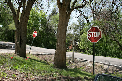 I drive by this everyday on the way to work and I have always wondered why they needed 2 stop signs....it is not a very busy street...but I loved the 2 stop signs between the 2 trees.